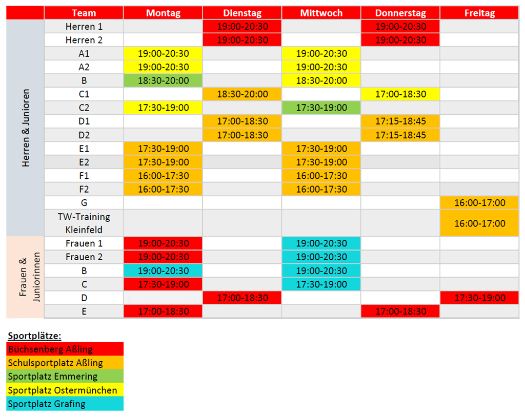 In der Regel findet das Training während des Spielbetriebs von März bis November auf unseren Sportplätzen statt. In Winterpause von Dezember bis Februar findet ein eingeschränkter Trainingsbetrieb in der Halle statt.