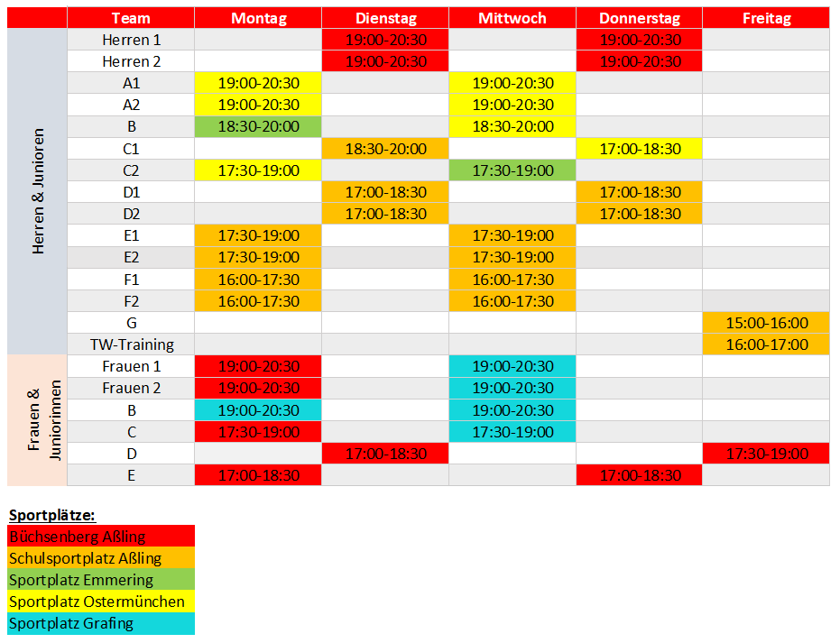 In der Regel findet das Training während des Spielbetriebs von März bis November auf unseren Sportplätzen statt. In Winterpause von Dezember bis Februar findet ein eingeschränkter Trainingsbetrieb in der Halle statt.